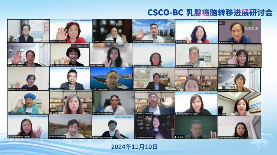 2024年11月19日晚19:00,全国各地乳腺癌诊断、治疗相关专家齐聚云端,“CSCO BC乳腺癌脑转移进展研讨会”正式开始。大会主席、CSCO候任理事长、解放军总医院江泽飞教授致开场辞,并提出CSCO BC将与CSCO神经系统肿瘤专家委员会携手共进,集合影像、诊断、放疗、内科等多学科力量,共同成就新版的《CSCO乳腺癌脑转移临床诊疗专家共识》。