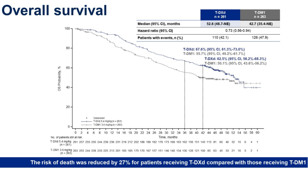 2024年ASCO大会进一步更新了这项研究的OS结果[3],显示T-DXd治疗可延长患者的OS至52.6个月,而T-DM1治疗组OS为42.7个月;风险比分析显示相较于T-DM1,T-DXd治疗可降低27%的死亡风险(95%CI 0.56-0.94)。