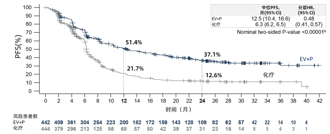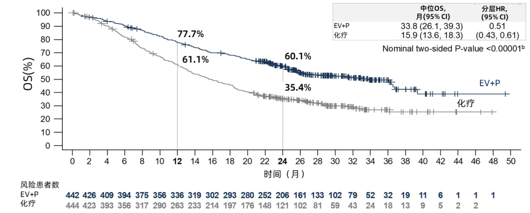 本次会议上更新了EV-302研究29.1个月的中位随访数据,并评估了达到完全缓解(cCR)患者的疗效和安全性。研究结果显示,与化疗组相比,EV+P联合方案中位PFS延长了6.2个月(12.5个月vs.6.3个月),近乎翻倍,并使肿瘤进展或死亡的风险降低了52%(HR=0.48;95%CI 0.41~0.57;P<0.00001);中位OS延长至33.8个月(95%CI 26.1~39.3),与化疗组相比中位OS(15.9个月,95%CI 13.6~18.3)延长了17.9个月,生存获益翻倍,死亡风险降低了49%(HR=0.51;95%CI:0.43~0.61;P<0.00001)。