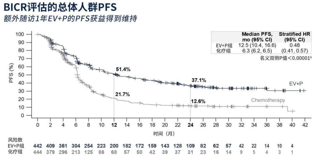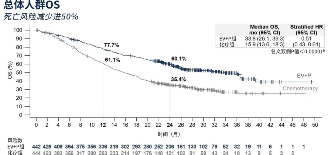 2025年ASCO-GU大会上,EV-302研究进一步更新了中位随访29.1个月的数据,结果显示了一致的EV+P带来的PFS(12.5 vs 6.3个月,HR 0.48,95%CI:0.41-0.57,P<0.001)和OS(33.8 vs 15.9个月,HR 0.51,95%CI:0.43-0.63,P<0.001)获益[4]。由此可见,随着研究随访时间的延长,EV+P一线治疗的生存获益仍然保持相较于化疗的显著性差异;而且长期随访未发现新的安全性信号,进一步证实了联合治疗的持续耐受性良好。