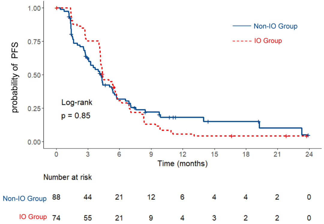 对ORIENT-31试验中化疗组162名患者分析发现,74名患者在化疗治疗进展后接受了免疫交叉治疗(IO组),而88名未接受免疫治疗(非IO组)。