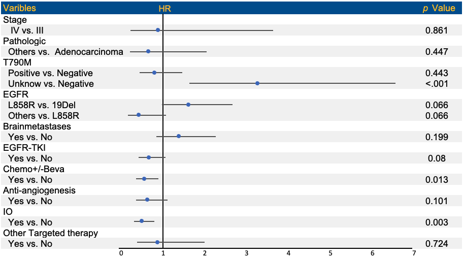 采用多因素Cox回归分析校正后线治疗方案的影响,结果显示,化疗治疗进展后的免疫治疗与死亡风险降低显著相关(HR 0.49,95%CI 0.30-0.78,p=0.003)(图3)。