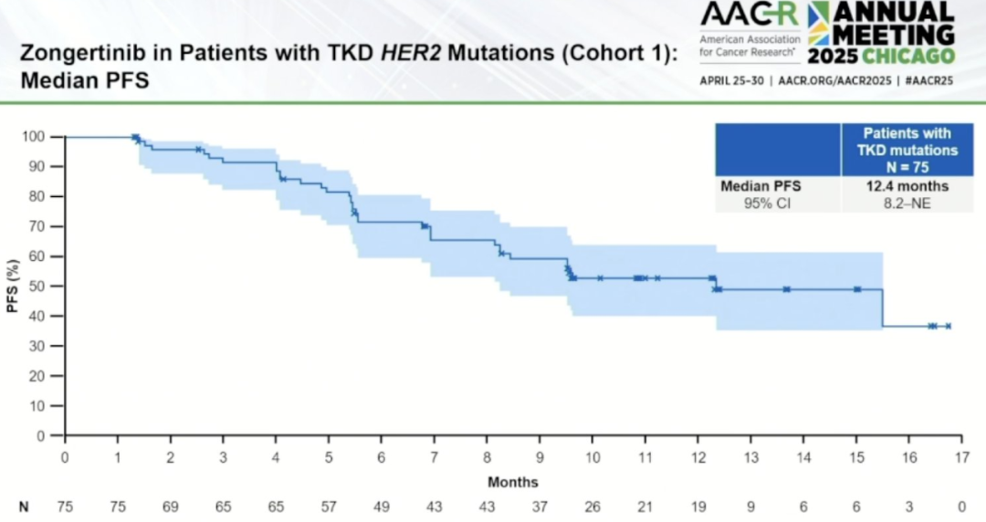 在队列1(n=75)中接受治疗的携带TKD HER2突变的患者中,ORR为71%(95%CI:60%-80%),其中完全缓解(CR)率为7%,部分缓解(PR)率为64%。疾病稳定(SD)和疾病进展(PD)的比例分别为25%和4%,疾病控制率(DCR)为96%(95%CI:89%-99%)。该队列基线靶病变的最佳变化中位数为-43%(范围:-100%-22%)。