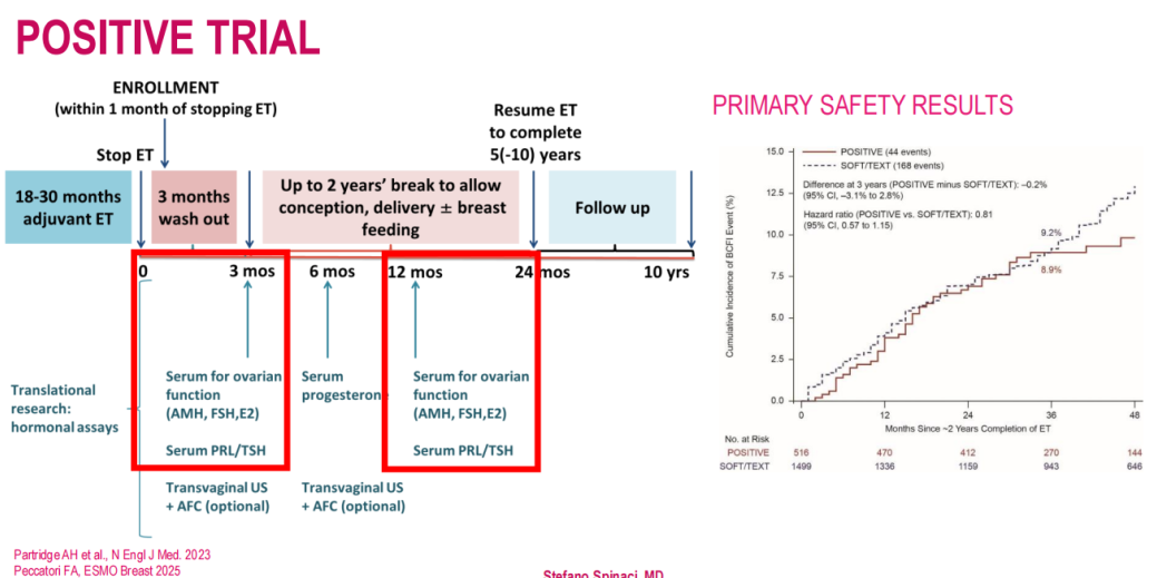 POSITIVE试验表明,乳腺癌患者可中断辅助内分泌治疗以尝试受孕。尽管其中74%的患者成功受孕,其中部分患者应用了卵母细胞冻存或胚胎冻存,但有关卵巢早衰(POI)、低卵巢储备(LOR)以及妊娠相关因素的数据仍然有限。