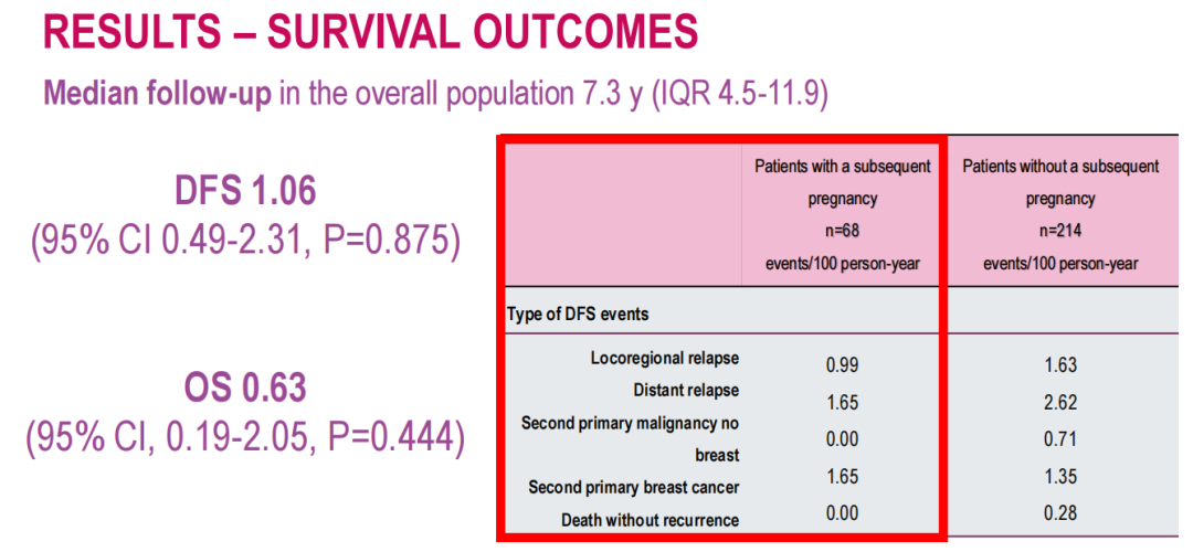 妊娠患者与未妊娠患者之间在无病生存期(DFS)(校正风险比1.06;95%CI:0.49~2.31)或总生存期(OS)(校正风险比0.63,95%CI:0.19~2.05)方面,没有观察到显著差异。在两个队列中,大多数患者发生的DFS事件均为远处转移(在后续妊娠的患者和未妊娠的患者中分别为每100人/年1.65例和2.62例)。