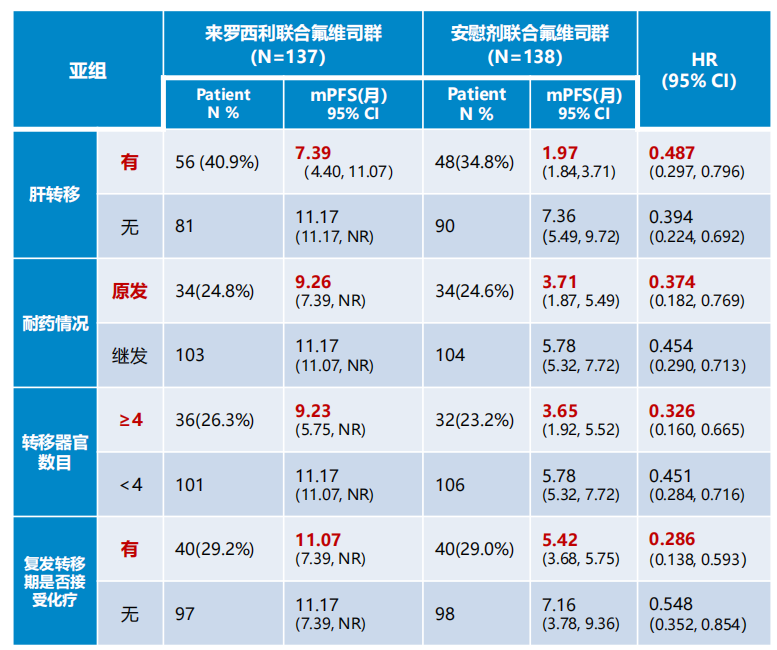 预先设定的PFS亚组分析显示,不同亚组患者的结果与整体研究结果一致,包括年龄(<65岁或>65岁)、是否绝经、激素受体状态、既往内分泌治疗耐药情况、既往内分泌治疗目的、既往复发/转移期是否接受过化疗、是否内脏转移、是否肝转移是否存在可测量病灶、以及基线美国东部肿瘤协作组(ECOG)体能状态等。在亚组分析中,来罗西利组在肝转移、原发耐药、转移器官数目≥4(高肿瘤负荷)以及既往接受过化疗等高危难治人群中同样表现出色。