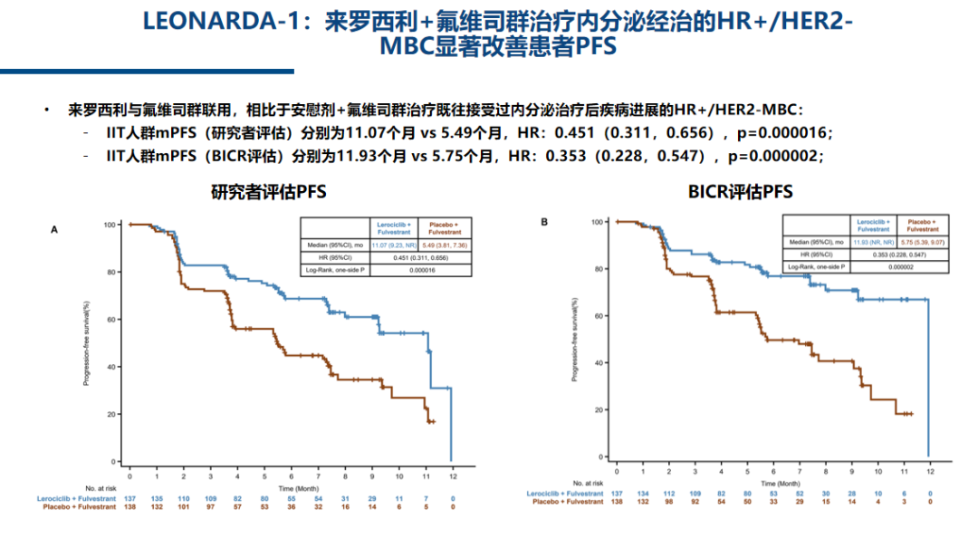 LEONARDA-1(NCT05054751)是由中国医学科学院肿瘤医院徐兵河教授牵头的一项随机、双盲、III期研究,旨在评估来罗西利在中国人群既往接受内分泌治疗后疾病复发或进展的HR+/HER2-晚期或转移性乳腺癌患者中的疗效和安全性。该研究共纳入了275名中国患者,并按1:1的比例随机分配,接受来罗西利(137名患者,150mg,每日两次)或安慰剂(138名患者)联合氟维司群的治疗。