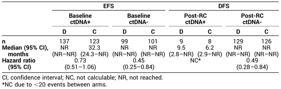 在这项探索性分析中,RC前ctDNA阳性状态与non-pCR相关。度伐利尤单抗组患者从基线到RC前的ctDNA清除率更高,表明相比于单纯新辅助化疗方案,度伐利尤单抗方案联合新辅助化疗具有额外获益。围手术期度伐利尤单抗方案为基线ctDNA阳性和阴性状态的患者均提供了EFS获益;RC后基于ctDNA状态的DFS也观察到了类似的趋势。这些结果进一步支持了MIBC患者围手术期度伐利尤单抗方案的有效性。