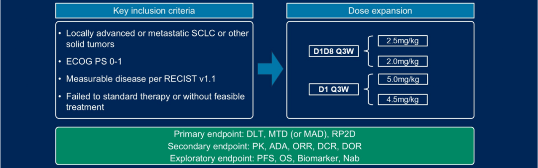 研究纳入了既往接受过系统治疗后进展的局部晚期或转移性SCLC患者。患者分别接受以下剂量方案治疗:2.0 mg/kg或2.5 mg/kg(D1D8 Q3W方案),或4.5 mg/kg或5.0 mg/kg(D1 Q3W方案)。每6周进行一次肿瘤影像学评估。在总体人群和特定亚组中评估疗效,特别关注既往治疗线数有限的患者亚组。