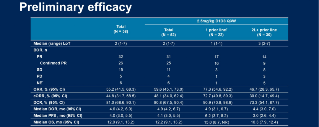截至2024年12月5日,共纳入58例SCLC患者。所有接受至少一剂iza-bren治疗的患者均纳入分析。中位随访时间为16.4个月。总体人群的总缓解率(ORR)为55.2%,确认的ORR为44.8%,中位无进展生存期(PFS)为4.0个月,中位总生存期(OS)为12.0个月。在52例接受2.5 mg/kg剂量治疗的患者中,有20例患者既往仅接受过一线PD(L)-1抑制剂联合铂类为基础的化疗(PBC)。在该亚组中,ORR为80.0%,确认的ORR为75.0%,中位缓解持续时间(DOR)为5.6个月,中位PFS为6.9个月,中位OS为15.1个月。
