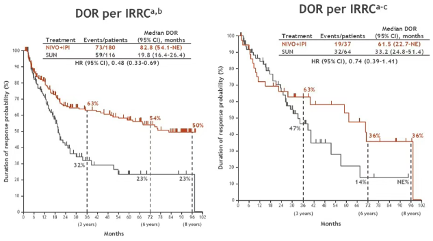 在ITT人群中,纳武利尤单抗/伊匹木单抗方案的中位缓解持续时间几乎是舒尼替尼方案的3倍(76.2个月vs 25.1个月)。