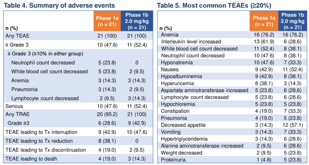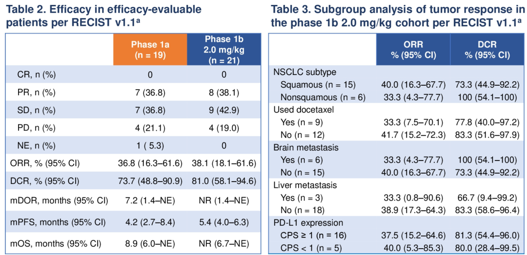 王洁教授:在有效性方面,Ia期患者中位随访9.7个月显示,研究者评估的ORR为36.8%,中位无进展生存期(mPFS)达4.2个月。Ib期研究仍在进行中,此次仅披露了2.0 mg/kg剂量组结果。中位随访7.0个月显示,NSCLC患者ORR为38.1%,mPFS延长至5.4个月,OS尚不成熟。