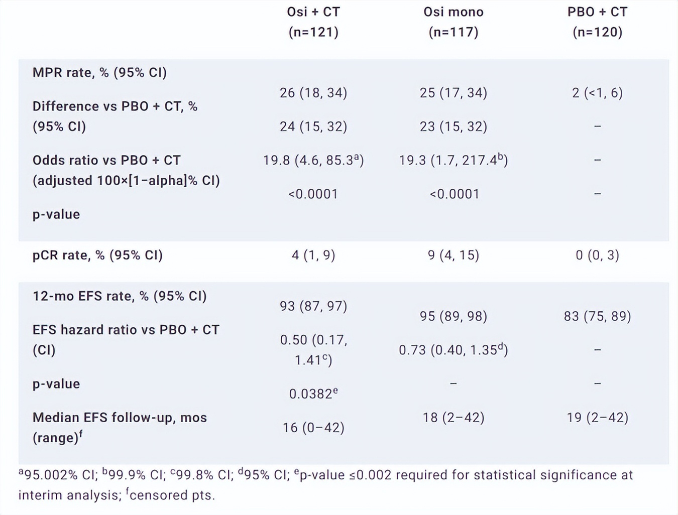 在这项研究中,患者年龄≥18周岁,PS评分0-1分,患者携带19del或21L858R突变,分期为II-IIIb期(第8版分期)。研究基于分期(II vs.III期)、种族(非亚裔、中国人、其他亚裔)和突变类型(19del vs.21L858R)进行分层。符合入组标准的患者按1:1:1的比例,随机分为奥希替尼80 mg,口服,每日一次,治疗时间超过9周;联合3周期化疗(顺铂或卡铂联合培美曲塞)或超过9周的标准剂量的奥希替尼治疗,或单纯化疗。所有患者均可以接受术后辅助奥希替尼治疗。主要研究终点为独立评审委员会评估的MPR,次要研究终点包括pCR、EFS及安全性。数据随访截止时间2024年10月15日。