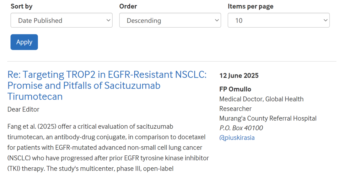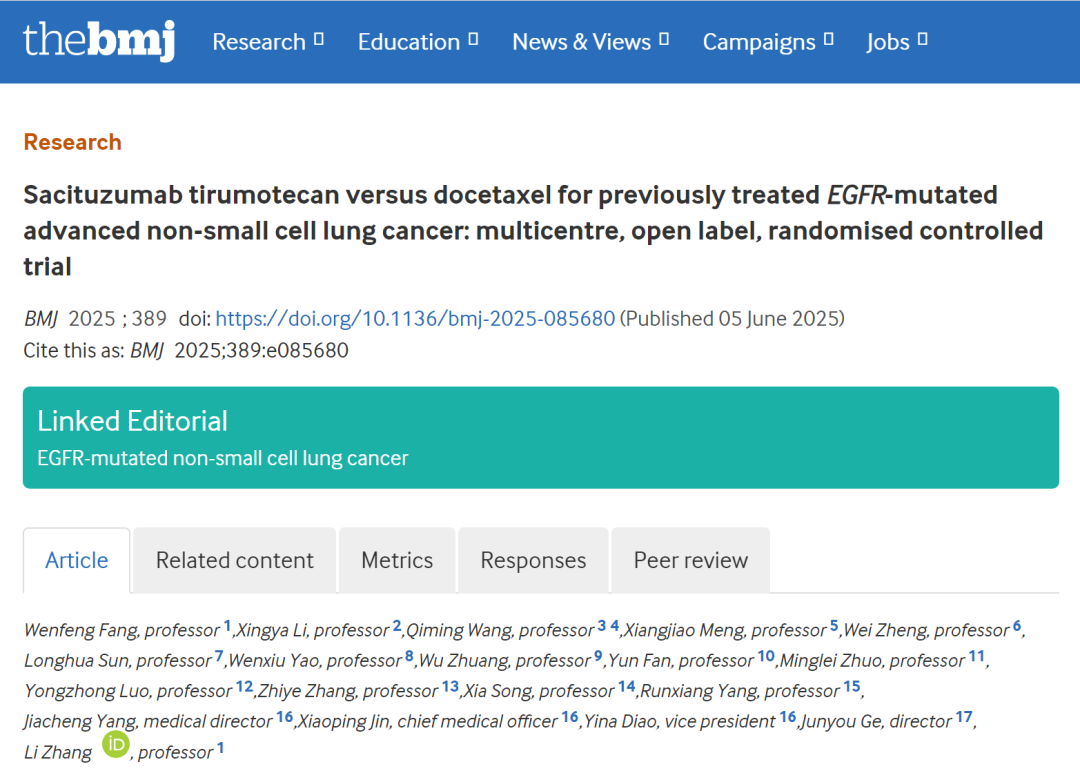 编者按:近日,被誉为全球四大医学期刊的《英国医学杂志》(The BMJ)在线发表了中山大学肿瘤防治中心张力教授牵头开展的OptiTROP-Lung03研究成果,而在刚刚落幕在2025年ASCO大会上,张力教授曾在口头报告中汇报过该研究成果。连续登顶最高学术会议和顶级医学期刊,不仅表明了芦康沙妥珠单抗在晚期NSCLC领域取得了突破性进展,也体现了国际专家对该团队研究成果的肯定。来自Murang’a County Referral Hospital的FP Omullo博士给予高度评价,认为该研究有望重新定义EGFR突变NSCLC的二线或三线治疗。