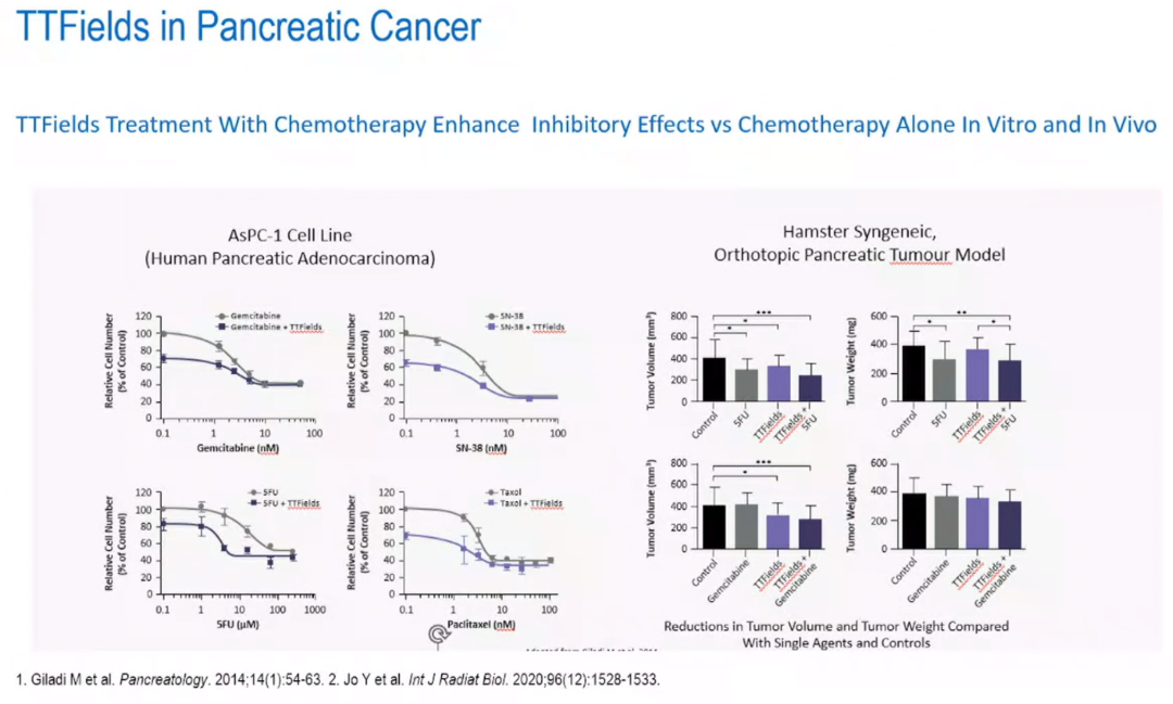 目前已有多项临床前及临床研究证实了TTFields在胰腺癌的治疗效果。体外实验数据及原位移植瘤模型[4,5]证实TTFields具有抗肿瘤活性,且与化疗药物存在协同作用(图2)。当前临床实践中,多以吉西他滨联合紫杉醇作为TTFields的治疗搭档[6]