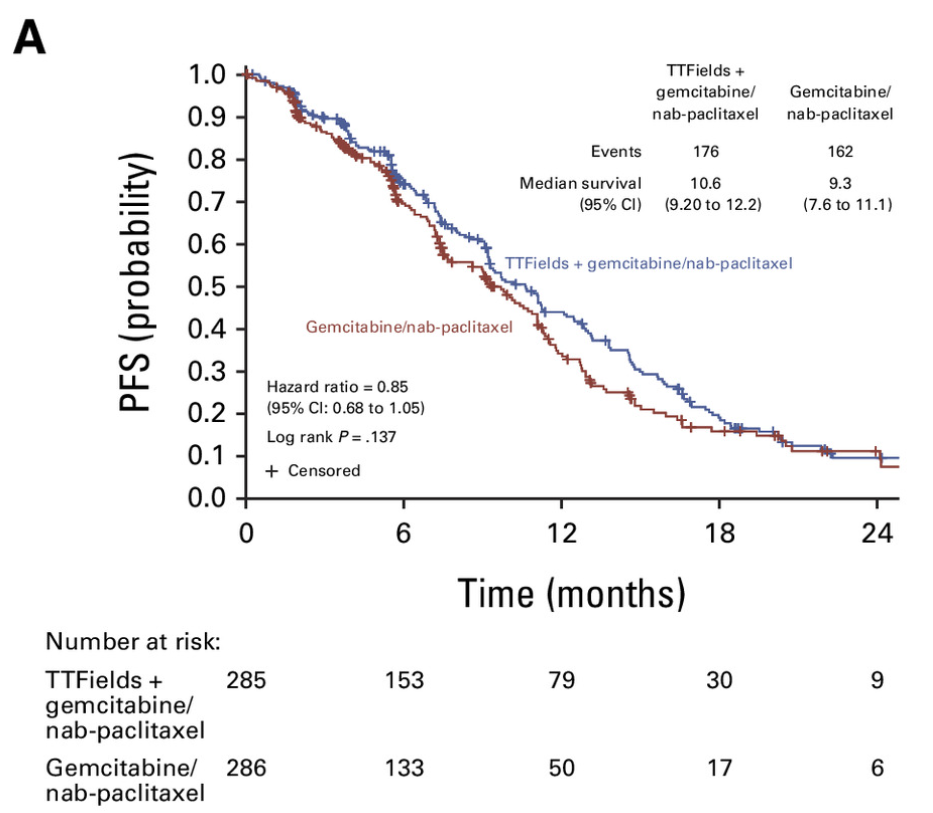 PANOVA试验[7]是一项多中心、开放标签、Ⅱ期单臂临床试验,共纳入40例晚期胰腺癌的患者,予以TTFields联合吉西他滨±白蛋白紫杉醇进行治疗。结果显示,主要研究终点安全性方面,21例患者报告了治疗相关的皮肤不良事件,其中7例为3级不良事件,经过减量后缓解,未见严重不良事件。次要研究终点显示,TTFields联合吉西他滨组的中位无进展生存期(mPFS)为8.3个月,中位总生存期(mOS)为14.9个月;TTFields联合吉西他滨及白蛋白紫杉醇组的mPFS为12.7个月,比单用吉西他滨联合紫杉醇的效果更好(图3),为进一步探索奠定了基础。