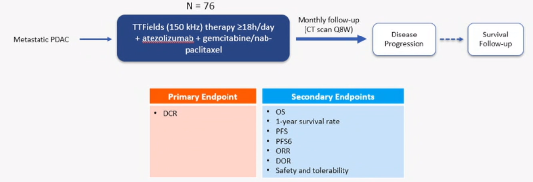 在TTFields增强免疫疗效的机制下,Teresa Macarulla Mercade教授启动了单臂Ⅱ期PANOVA-4试验(EudraCT 2022-003157-55)[14],计划纳入76例转移性胰腺癌患者,采用TTFields联合阿替利珠单抗+吉西他滨+白蛋白紫杉醇方案一线治疗,主要终点为疾病控制率(DCR),目前已完成患者招募,值得期待(图9)。