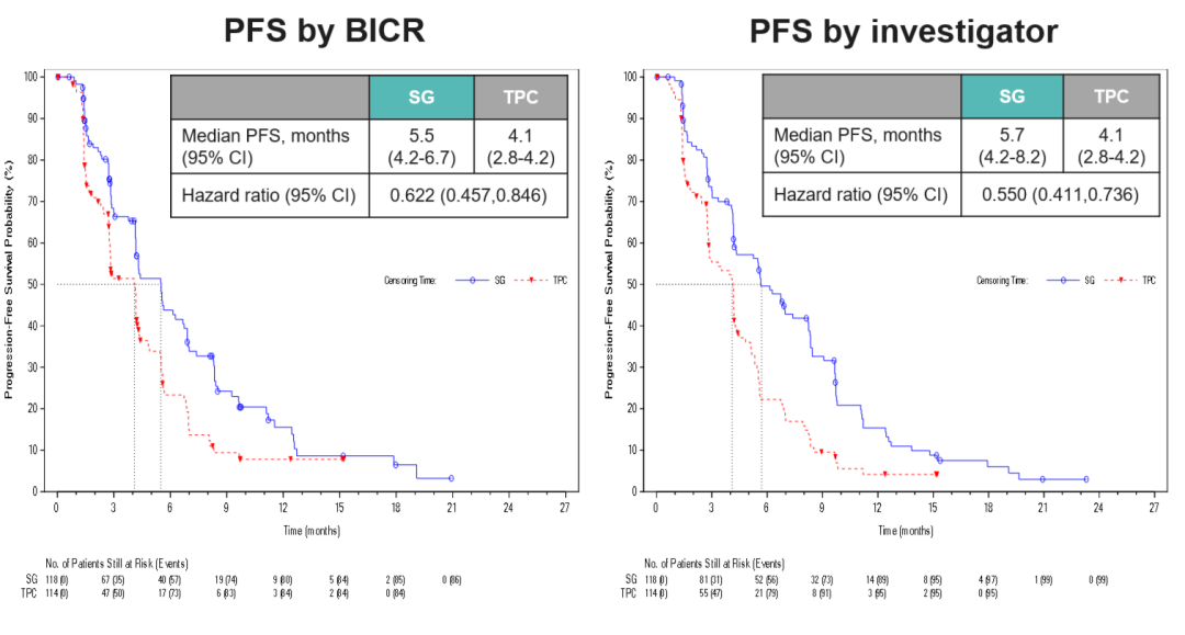此次披露的数据显示,中位随访13.6个月,戈沙妥珠单抗较TPC改善了BICR评估的mPFS,为5.5个月vs 4.1个月,HR 0.622(95%CI:0.457-0.846);研究者评估的mPFS为5.7个月vs 4.1个月,HR 0.550(95%CI:0.411-0.736);且各亚组获益一致。从绝对值上看,戈沙妥珠单抗为中国人群带来的PFS获益较整体人群具有优势的趋势。