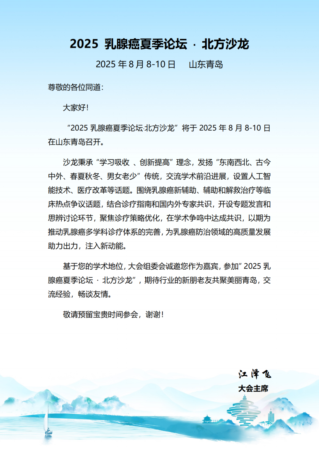 琴岛夏日之约!江泽飞教授诚邀大家共赴“2025乳腺癌夏季论坛·北方沙龙”