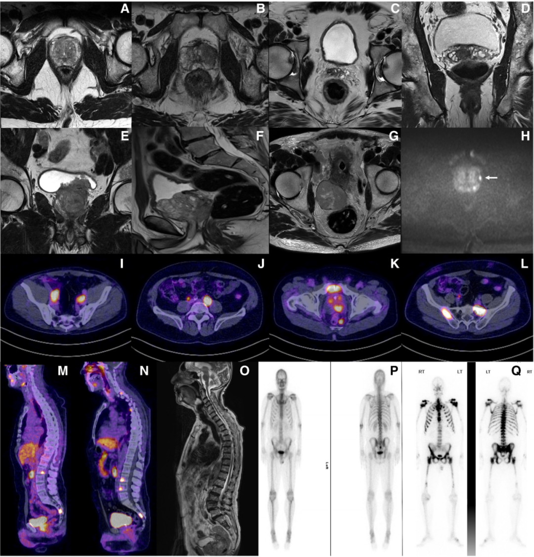 △前列腺癌的影像学诊断:前列腺MRI(A-H)、PSMA-PET(I-N)、全身MRI(O)以及骨扫描(P、Q)