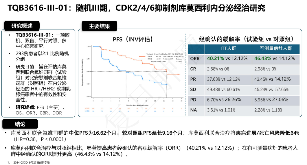此外,CDK4i、CDK2/4/6i也在HR+/HER2-晚期乳腺癌患者治疗中进行着探索。TQB3616-111-01是一项随机、双盲、平行对照、多中心临床研究,旨在评估我国自主研发的CDK2/4/6抑制剂库莫西利联合氟维司群和安慰剂联合氟维司群(对照组)在既往内分泌经治的HR+/HER2-晚期乳腺癌的有效性和安全性。该研究共纳入了293例患者,以2∶1比例随机进行分组,研究结果显示,库莫西利组中位无进展生存期(PFS)达16.62个月,较对照组PFS延长9.16个月,库莫西利联合治疗将疾病进展/死亡风险降低64%(HR=0.36,P<0.0001)。库莫西利联合治疗与对照组相比,显著提高患者经确认的客观缓解率(ORR,40.21%vs 12.12%),在有可测量病灶的患者人群中,经确认的ORR提升更高(46.43%vs 14.12%)。