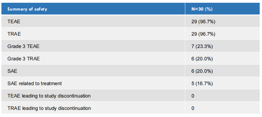 30例患者中有29例(96.7%)出现了至少一项治疗期间出现的不良事件(TEAE)。7例患者(23.3%)出现了3级或以上的TEAE。未发生导致治疗终止的不良事件。未出现间质性肺疾病。在肝毒性、血液学毒性等艾立布林常见毒性方面,未发现需要特别关注的不良事件。