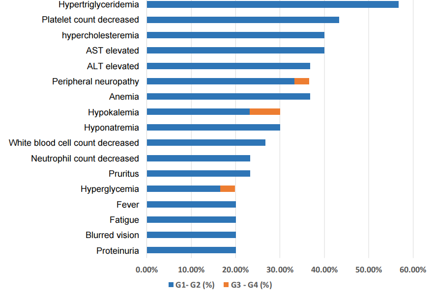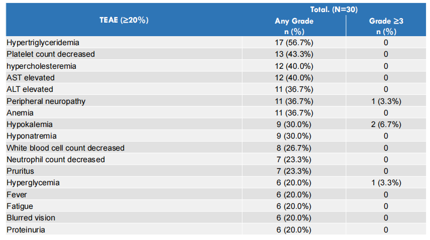 常见TEAE包括:高甘油三酯血症、血小板减少、高胆固醇血症、AST升高、ALT升高、周围神经病变、贫血、低钾血症、低钠血症、白细胞减少等。发生率≥20%的TEAE见表3和图1。