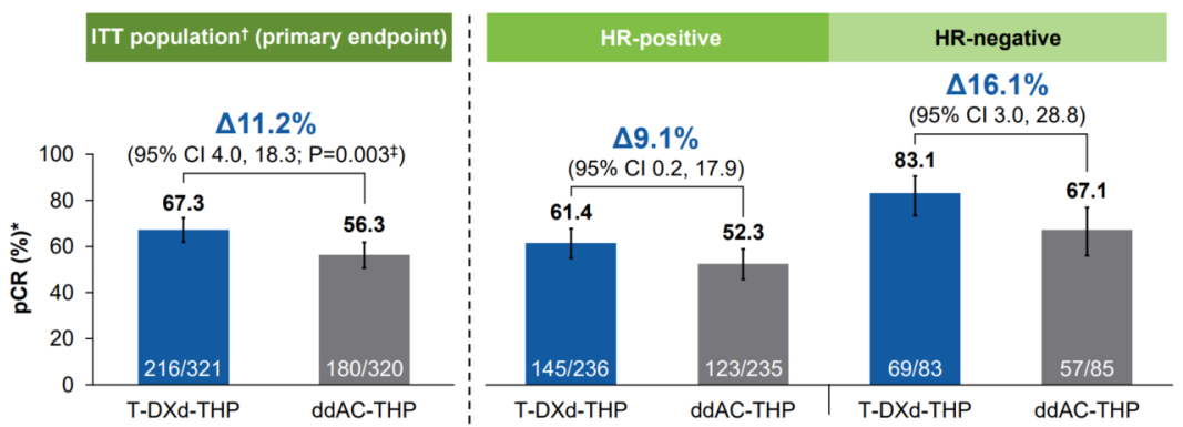 由于T-DXd单药组因pCR率偏低、单药疗效优于ddAC-THP标准疗法的可能性低及手术时机等原因,在试验过程中提前关闭,此次ESMO披露了该研究T-DXd-THP组(321例)、ddAC-THP组(n=320)结果。结果显示,T-DXd-THP组较ddAC-THP组显著提升了11.2%的pCR率,为67.3%vs 56.3%,P=0.003。