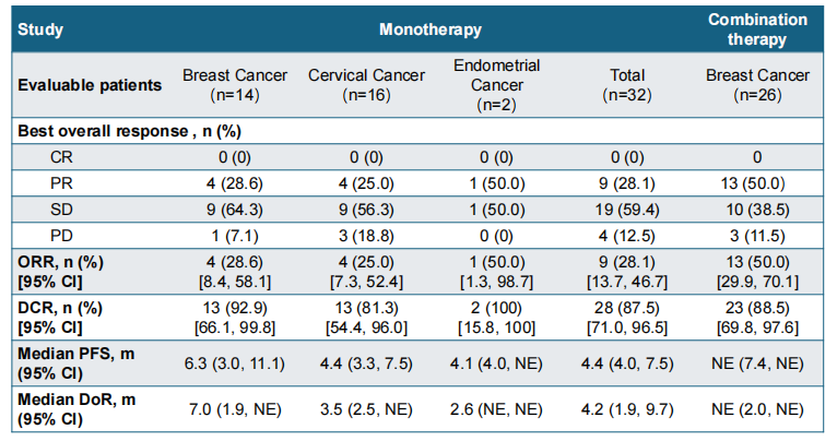 在单药治疗研究中,没有患者发生DLT,RP2D设定为250 mg。32例PIK3CA突变患者中,ORR为28.1%(95%CI:13.7%-46.7%),中位PFS为4.4(95%CI:4.0-7.7)个月,中位DoR为4.2(95%CI:1.9-9.7)个月(表2,图2-3)。其中,14例PIK3CA突变乳腺癌患者中,DCR达92.9%,中位PFS为6.3个月(表2)。