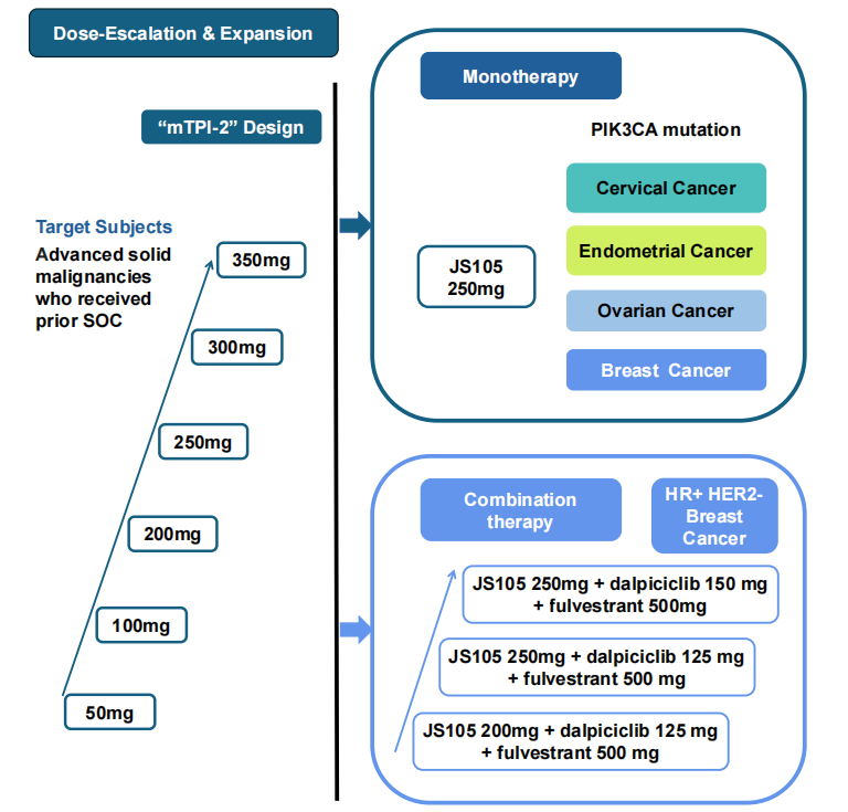 JS105单药治疗研究(NCT06846099)包括剂量递增和剂量扩展两部分,分别纳入了既往标准治疗失败的晚期实体瘤患者,接受JS105 50-350 mg,每日1次,28天为一个周期。联合治疗研究(NCT06208410)纳入了HR+/HER2-晚期乳腺癌患者,接受JS105 150-50 mg联合达尔西利和氟维司群治疗,28天为1个周期。主要观察指标为单药和联合治疗的安全性、耐受性、MTD和RP2D。