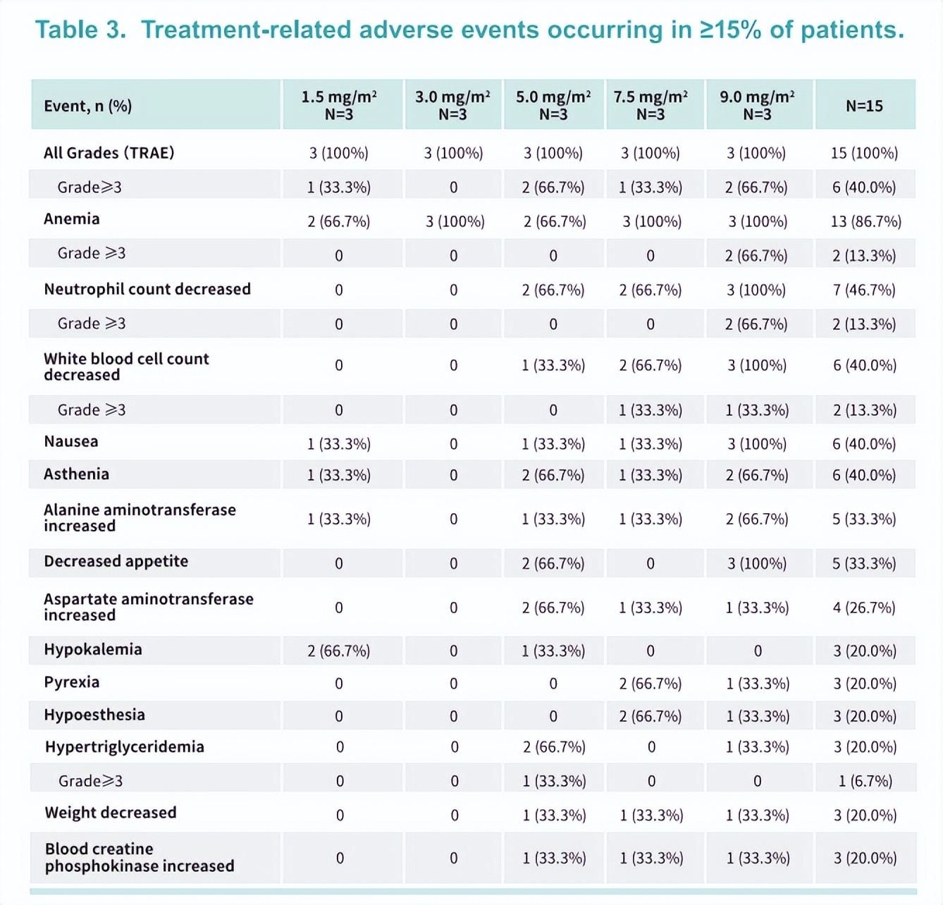 至数据截止日(2025年9月5日),在5.0、7.5和9.0 mg/m²剂量组均观察到PR,部分患者的持续缓解时间超过32周,并显示出持久且具有临床意义的抗肿瘤活性。
