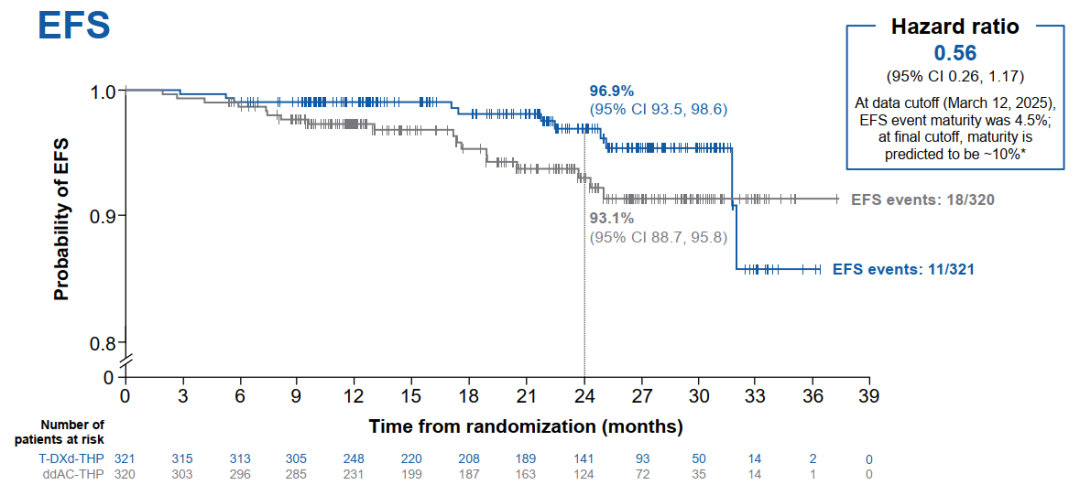 EFS早期趋势显示了疗效转化为生存获益,尽管数据截止时(2025年3月12日)EFS事件成熟度仅4.5%(预计最终成熟度约10%),但已观察到T-DXd-THP组的24个月的EFS优势趋势:T-DXd-THP EFS率96.9%,ddAC-THP组EFS率93.1%,风险比(HR)0.56(95%CI 0.26-1.17),提示T-DXd-THP的pCR优势可能进一步转化为长期无复发生存获益。