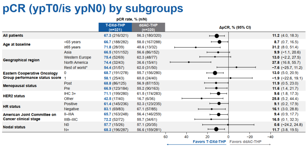DB-11研究的预设亚组分析证实,T-DXd-THP方案的pCR获益具有广泛普适性,不受关键基线特征影响。在HR阳性人群中,其pCR率为61.4%,较ddAC-THP方案提升9.1%;在HR阴性人群中,pCR率高达83.1%,提升幅度达16%。在淋巴结阳性的患者中T-DXd-THP方案方案pCR率从56.6%提升至68.3%,显著获益。此外,在所有其他预设亚组(包括年龄、地域、体能状态、HER2表达水平及绝经状态)中,T-DXd-THP均一致优于传统方案,彻底突破了传统方案在高危患者中的疗效局限。