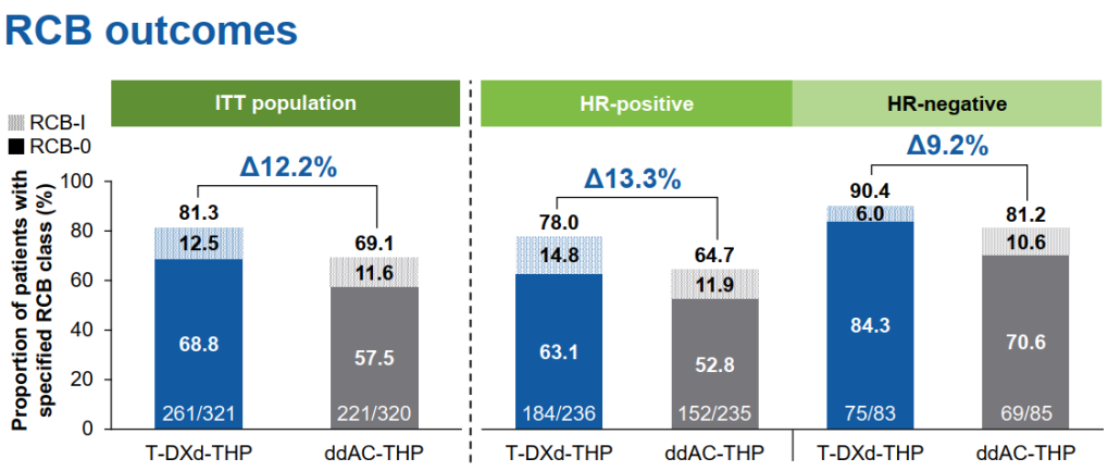 从残留癌负荷(RCB,评估术后肿瘤残留的关键指标)来看,T-DXd-THP组81.3%的患者达到RCB-0+I(无或极少残留浸润癌),而ddAC-THP组仅69.1%,进一步印证T-DXd-THP在肿瘤清除深度上的优势。