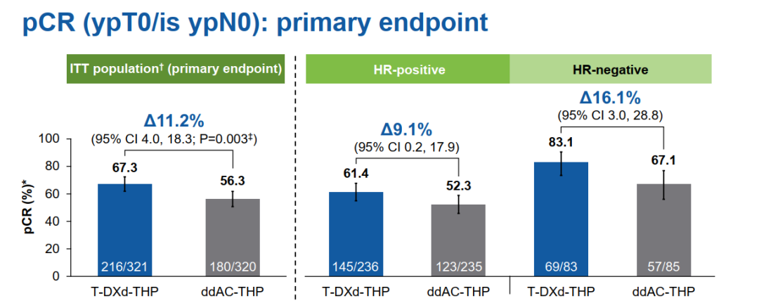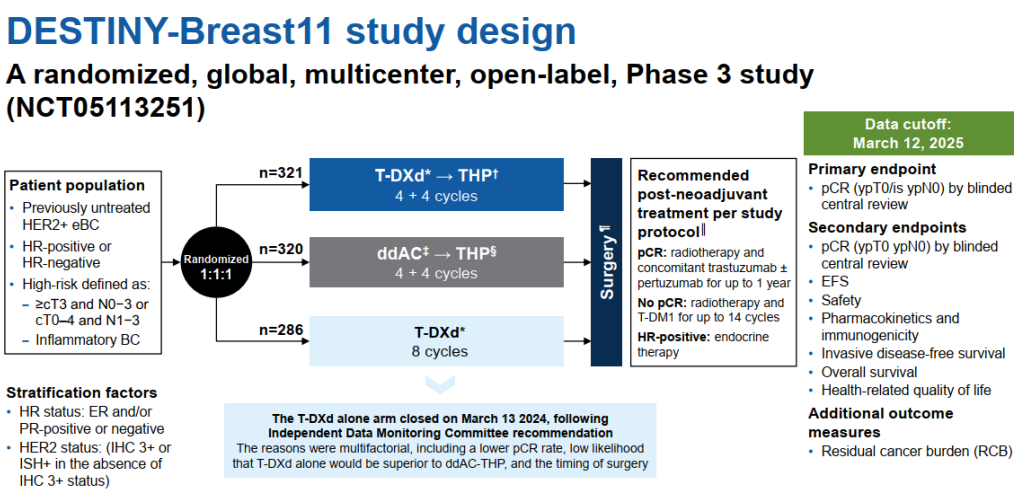 DB-11是一项全球多中心、随机、开放标签Ⅲ期研究,共纳入927例未经治疗的高风险HER2+早期乳腺癌患者,按1:1:1随机分至三个治疗组:T-DXd-THP组(n=321)、ddAC-THP组(n=320)和T-DXd单药组(n=286)。研究预设高风险人群定义为“临床肿瘤分期≥cT3且N0-3,或任意T分期且N1-3,或炎性乳腺癌”,并按HR状态(ER/PR阳性/阴性)、HER2状态(IHC 3+或ISH+)分层。主要终点为BICR评估的pCR(ypT0/is ypN0,即乳腺和腋窝淋巴结无浸润性癌或原位癌),次要终点包括EFS、安全性、药代动力学等。