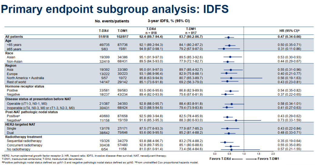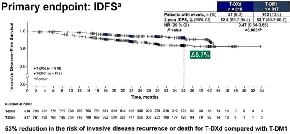 ESMO大会公布的中期分析结果显示主要终点3年IDFS率:92.4%vs 83.7%(HR=0.47),绝对获益8.7%;降低53%浸润性疾病复发或死亡风险。T-DXd组的疗效显著优于T-DM1组,且达到预设统计学显著性边界。风险降低幅度。