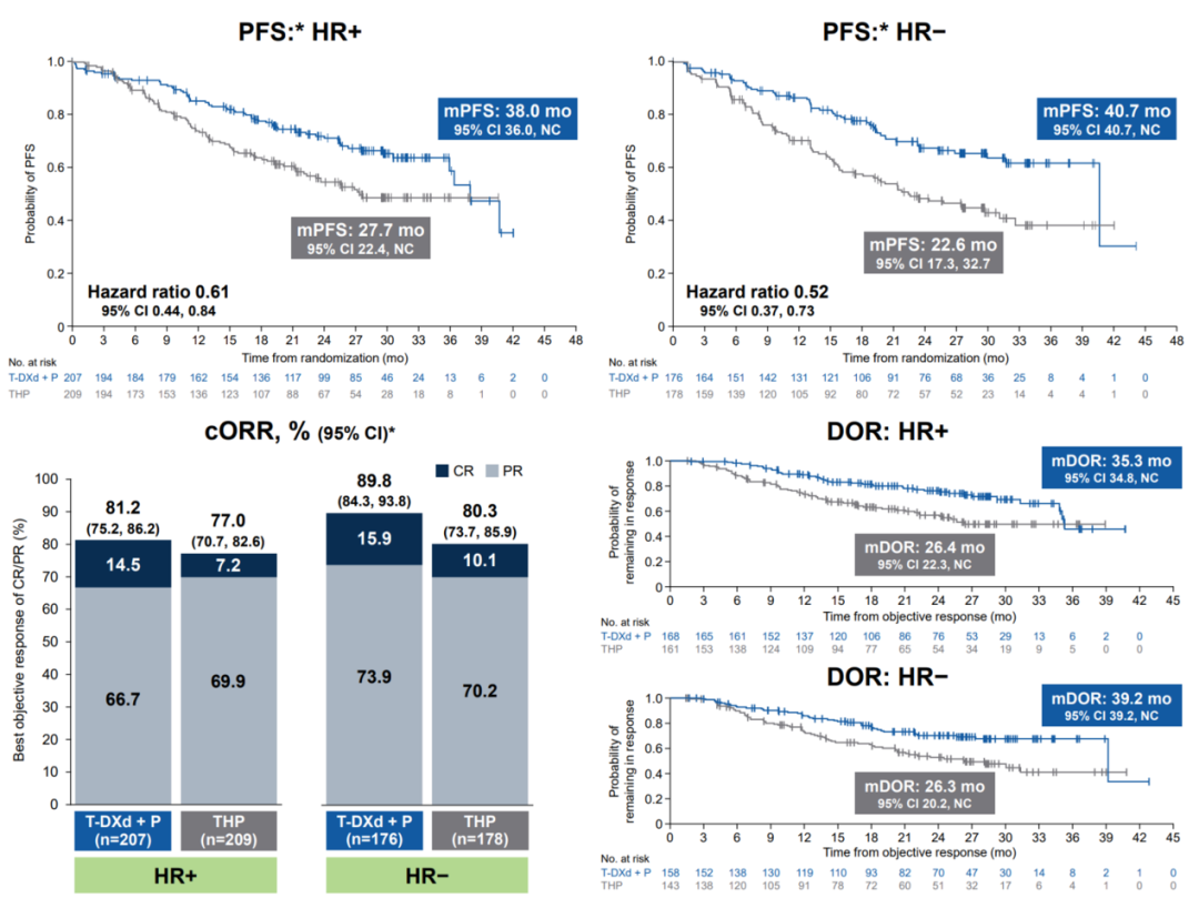 在DB-09研究中,HR+/HER2+患者占比达54%,T-DXd+P组mPFS达到38.0个月,较THP组的27.7个月显著延长,疾病进展或死亡风险降低39%;在HR阴性人群中,其mPFS为40.7个月,风险降低48%。此外,T-DXd+P组的完全缓解率在HR阳性人群中达到14.5%,是THP组(7.2%)的两倍,并且在HR阴性人群中也显示出显著优势。这一结果证实,无论HR状态如何,T-DXd+P均为患者提供了超越传统方案的一线治疗选择,并为后续探索其联合内分泌治疗的潜力奠定了坚实基础。