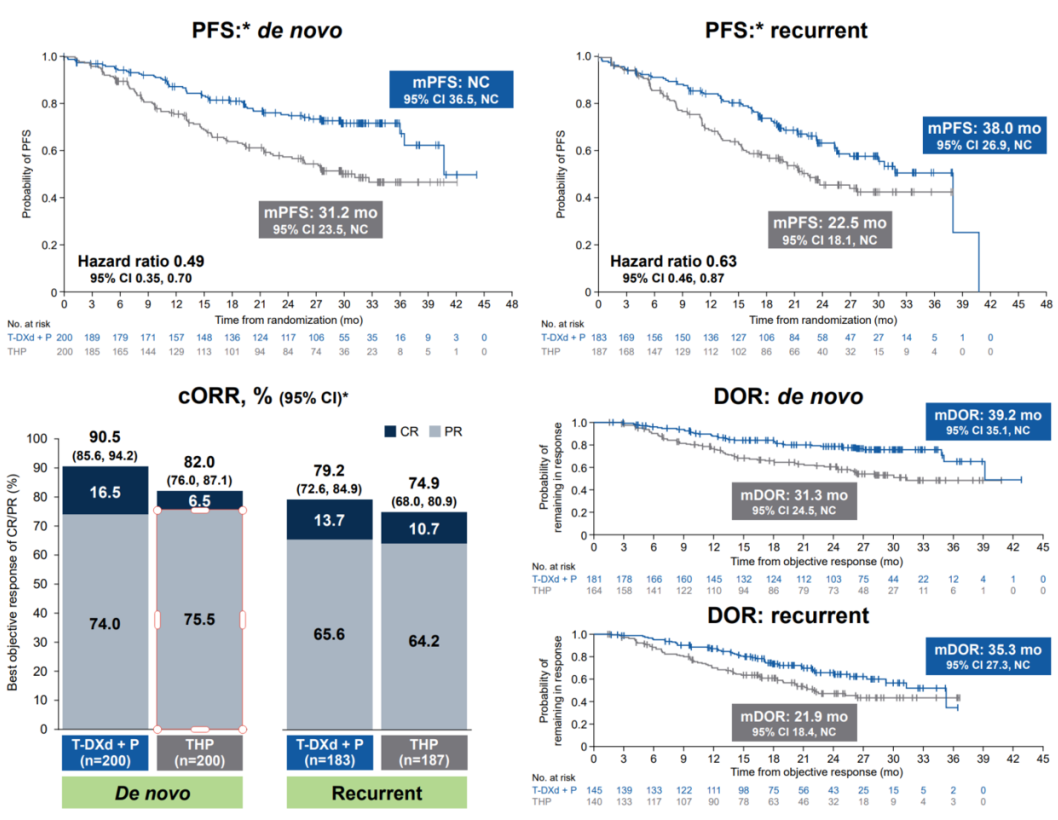 在DB-09预设分层中,初诊与复发两类患者均能从T-DXd+P一线治疗中获益,值得注意的是初诊患者采用T-DXd+P一线治疗所取得的cORR高达90.5%,CR为16.5%,提示初诊患者相对获益更为突出。总体来讲,无论是复发还是初诊的患者,T-DXd+P方案均使得患者从一线治疗中获得疗效获益。