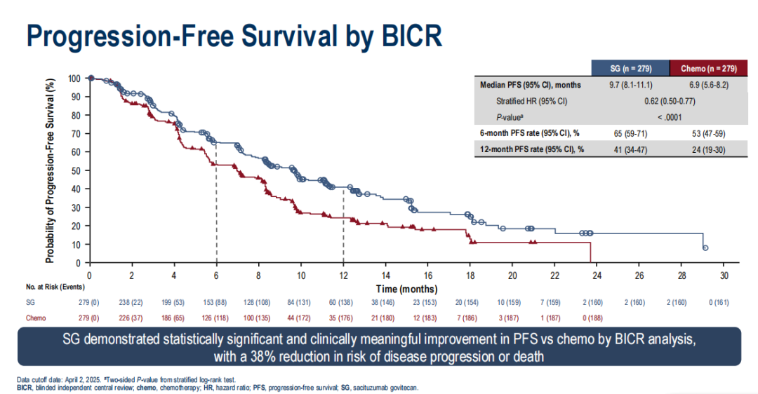 在三阴性乳腺癌领域,晚期一线治疗格局正在被靶向Trop-2的ADC重塑。本次ESMO会议公布的两项III期临床研究——ASCENT-03(评估戈沙妥珠单抗,SG)和TROPION-Breast02(评估德达博妥单抗,Dato-DXd)均在晚期一线患者治疗中分别取得了成功,为晚期乳腺癌患者提供了超越传统化疗的新选择。两项研究共同覆盖了不适合免疫治疗的mTNBC患者。其中ASCENT-03研究显示,与医生选择的化疗方案相比,戈沙妥珠单抗作为一线治疗方案可显著改善患者的无进展生存期,疾病进展或死亡风险降低38%,中位PFS延长至9.7个月(化疗组为6.9个月),且所有预设亚组均观察到一致获益。戈沙妥珠单抗的安全性可控,未出现新的安全信号。