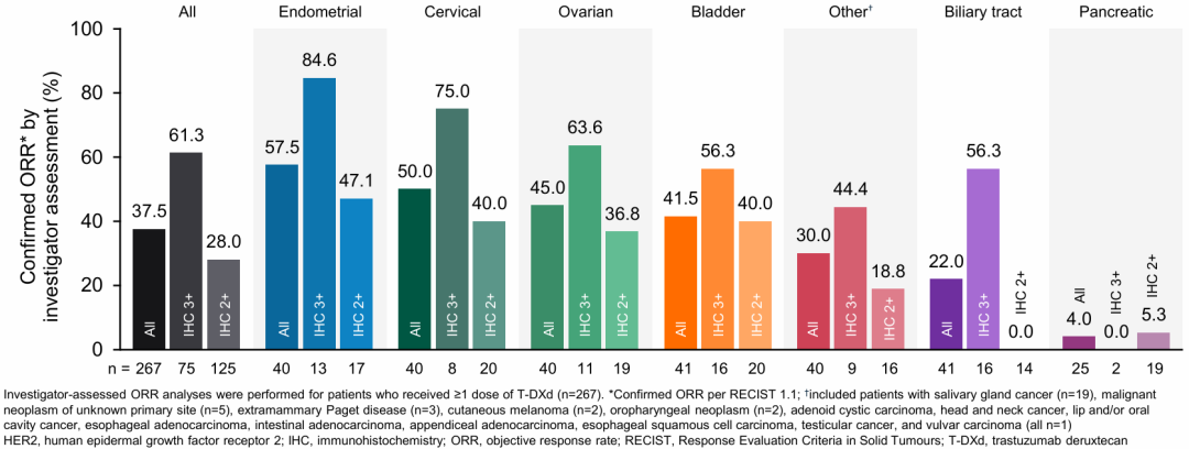 就主要终点而言,整体人群的ORR为37.5%,与既往报道相似;而中心实验室检测为HER2 IHC 3+人群有更为明显的获益,ORR为61.3%[1]