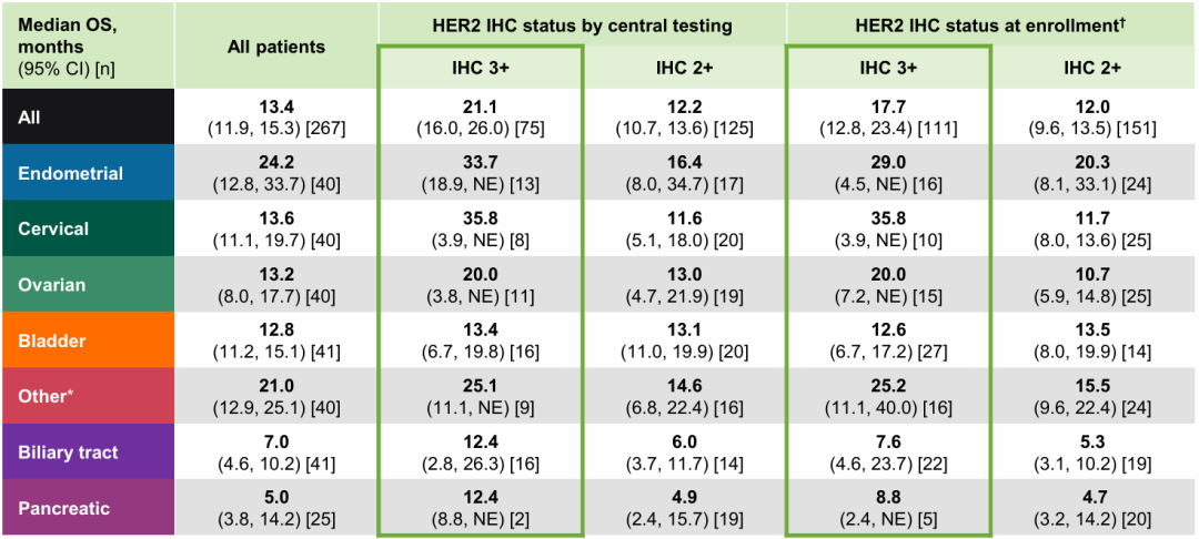 根据入组时采用的本地或中心HER2检测结果,研究者评估确认的ORR同样也是在HER2 IHC 3+肿瘤患者中最高,达52.3%(95%CI 42.6%-61.8%;n=111),在HER2 IHC 2+肿瘤患者中为26.5%(95%CI 19.6%-34.3%;n=151)。