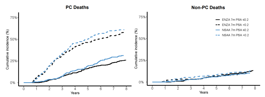 △7个月时不同PSA亚组(≤0.2 ng/ml或>0.2 ng/ml)的前列腺癌或其他原因死亡分析