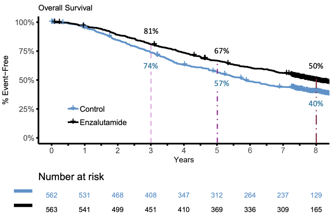 ENZAMET研究的8年随访结果强调了恩扎卢胺治疗的长期安全性、耐受性良好;与对照组相比,恩扎卢胺治疗有更低的因前列腺癌死亡比例以及更好的生存结局(无论7个月时PSA情况如何)。ENZAMET研究是前列腺癌领域具有划时代意义的里程碑,确立了“早期强化+长期维持”的核心模式。
