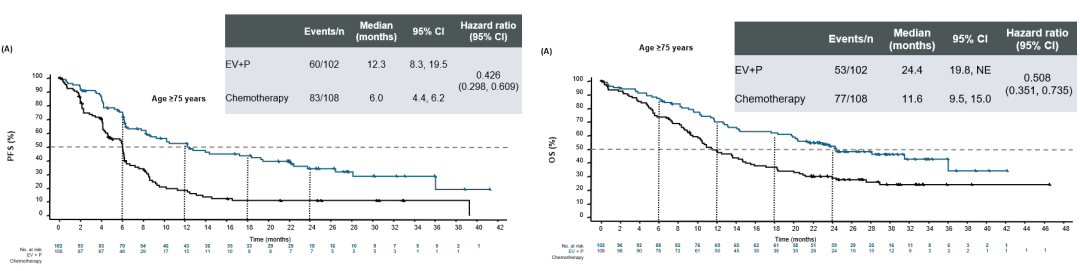 具体而言,对于老年患者(年龄≥75岁),维恩妥尤单抗联合方案组的中位PFS(12.3个月vs 6.0个月,HR 0.43)和OS(24.4个月vs 11.6个月,HR 0.51)均实现了相较于化疗的疗效翻倍,ORR(66.3%vs 38.3%)同样显著优于化疗组[5]