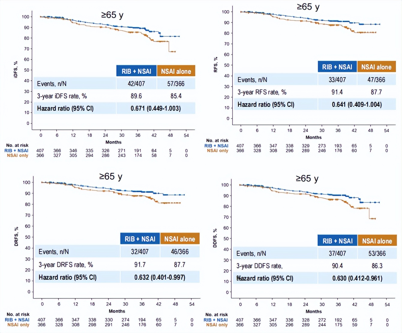 图3.NATALEE研究中≥65岁患者人群iDFS(左上)、RFS(右上)、DRFS(左下)、DDFS(右下)[17]