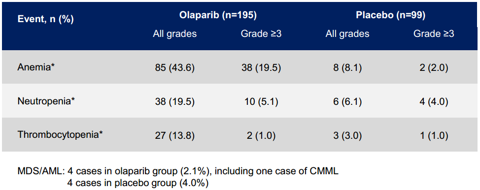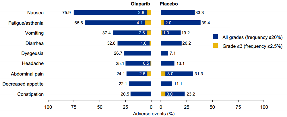 安全性耐受性分析结果显示,3 级以上任何不良 事 件(AE),Olaparib 组 发 生 率 为 36.9%,安慰剂组为 18.2%。最常见的非血液学不良事件包括:恶心 75.9%(≥ 3 级,2.6%)、疲劳 / 乏力 65.6%(≥ 3 级,4.1%)、呕吐 37.4%(≥ 3级,2.6%)。最常见的血液学不良事件包括贫血43.6% (≥ 3 级 , 19.5%)、中性粒细胞减少症19.5% (≥ 3 级 , 5.1%)、血小板减少症 13.8%(≥ 3级 , 1.0%)。因 AE 中断治疗者占 10.8%(21 例),因 AE 导致死亡者占 0.5%(1 例)。