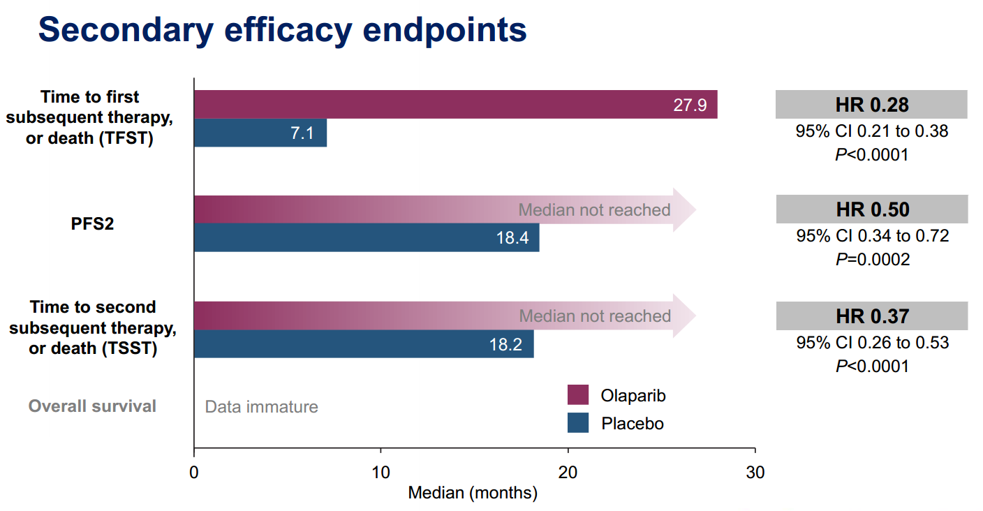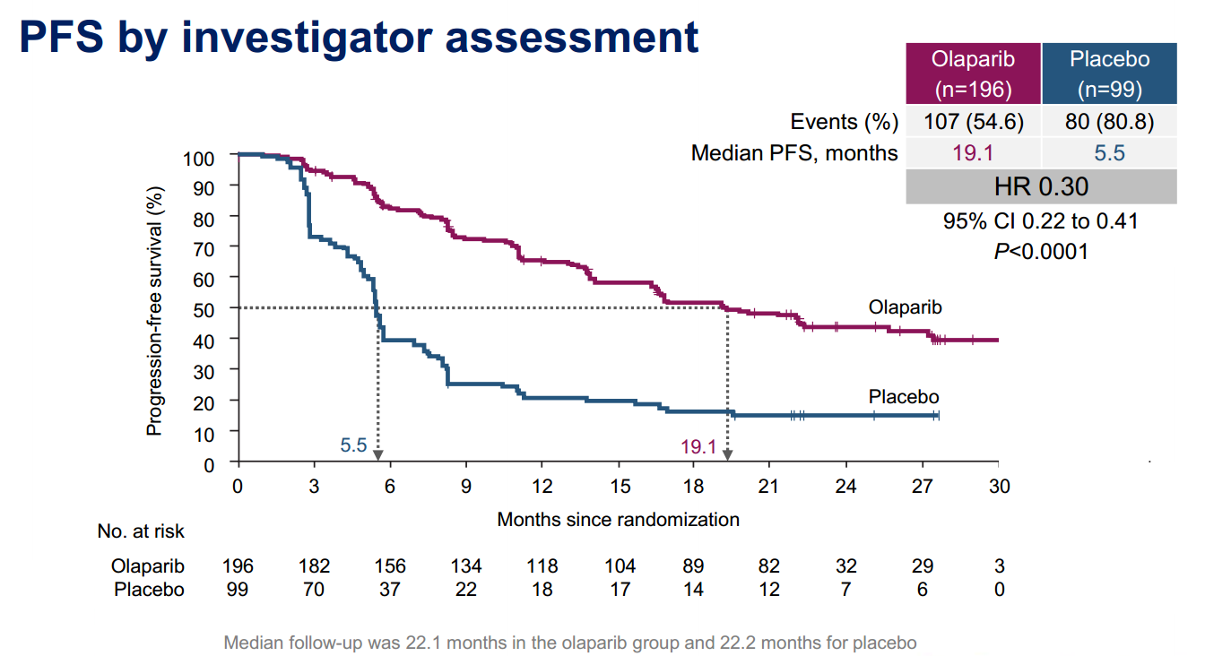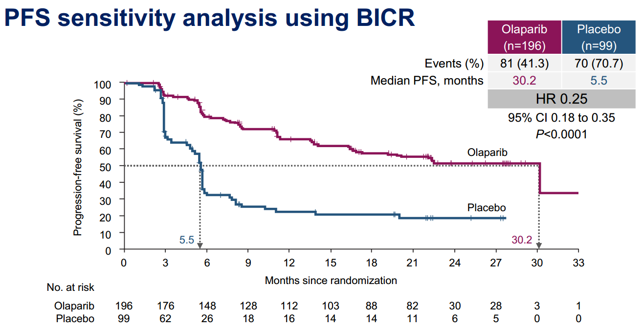 研究者评估的中位 PFS 延长至 19.1 个月,安慰剂组为 5.5 个月(HR: 0.30;95%CI:0.22~0.41;P<0.0001),疾病进展风险显著降低 70%(图1)。BICR 评 估 的 Olaparib 组 的 中 位 PFS 为30.2 个月(图 2),安慰剂组为 5.5 个月,差值为24.7 个 月(HR:0.25;95% CI:0.18~0.35;P<0.0001)。安慰剂组 PFS2 为 18.4 个月,而Olaparib 组尚未达到中值 PFS(图 3)。总生存数据不成熟。