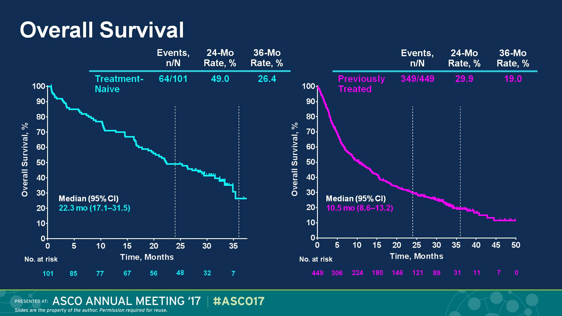 Vamsidhar Velcheti: ASCO报道了KEYNOTE-001中Pembrolizumab一线/二线治疗晚期非小细胞肺癌的3年总生存结果。根据2017ASCO的报道,550例晚期NSCLC患者纳入该试验,101例患者一线进行免疫治疗,其3年总生存率是26.4%;449例为经治患者的3年总生存率是19%。这项研究的有趣之处在于,任何患者都没有出现3~5级迟发毒性。