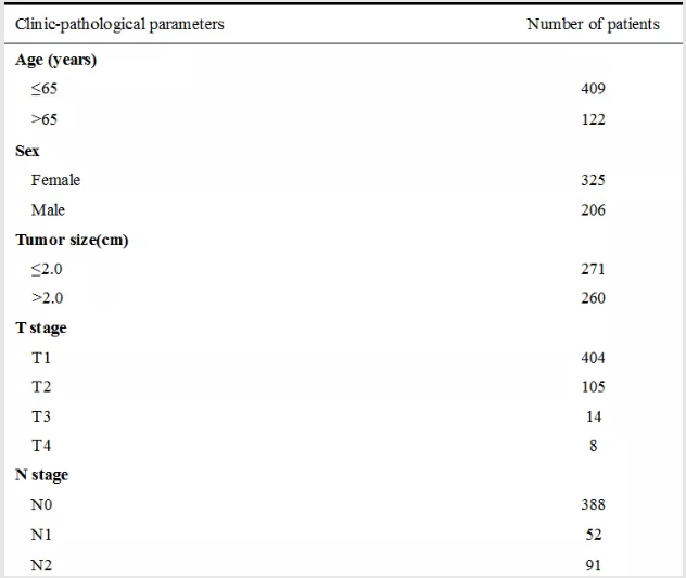 研究者们针对每位患者收集常见的临床病理因素包括年龄、性别、肿瘤大小、TNM分期、肿瘤分化情况、肿瘤组织学类型、是否淋巴血管侵犯、是否内脏胸膜浸润和EGFR突变亚型以及10种常规IHC标志物的表达水平包括Her2、Ki67、TTF-1、CK20、CK7、CK5/6、RRM1、NapsinA、Syn和p63。并根据初始术后复发情况分为五组:胸部复发组、脑部复发组、颈部复发组、腹部复发组和骨复发组。最终纳入531例患者的基线疾病特征如下表1所示,其中大多数患者是I期肺腺癌。