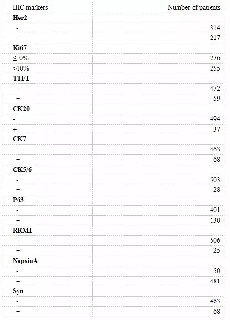 本研究中十种常规IHC标志物的表达水平如表2所示。值得注意的是,CK20和Syn的表达阳性率分别为7.0%和12.8%。